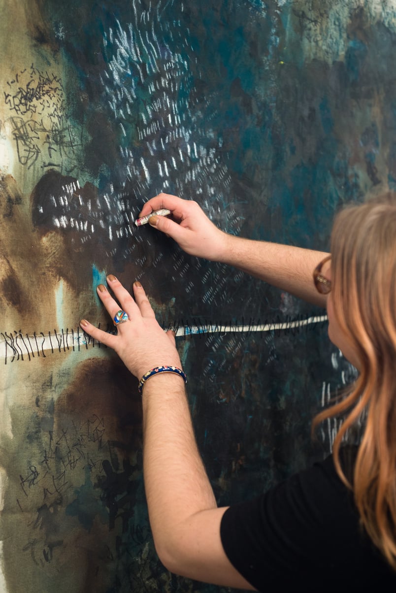 Sophia Pustejovsky is an artist who lives and works in Cambridge, MA. She is fascinated by the improvisational process, visceral color, the physicality of painting, color feelings, impermanence, and texture in excess. She is particularly drawn to the lifecycle of layering, destroying, and repeating, a method that results in dense planes of color and spatial depth.